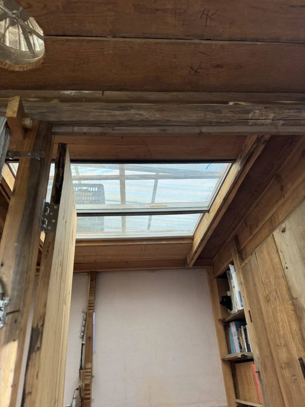 消解逼仄感,唯通透耳。废品站买了十块钱一个的冰柜门,双层玻璃,透明、隔温,安在炕间房顶。至于灶间,不仅透光,还要通风,不仅有四扇玻璃窗对开,而且顶板开洞,加装大口径的无动力风球。