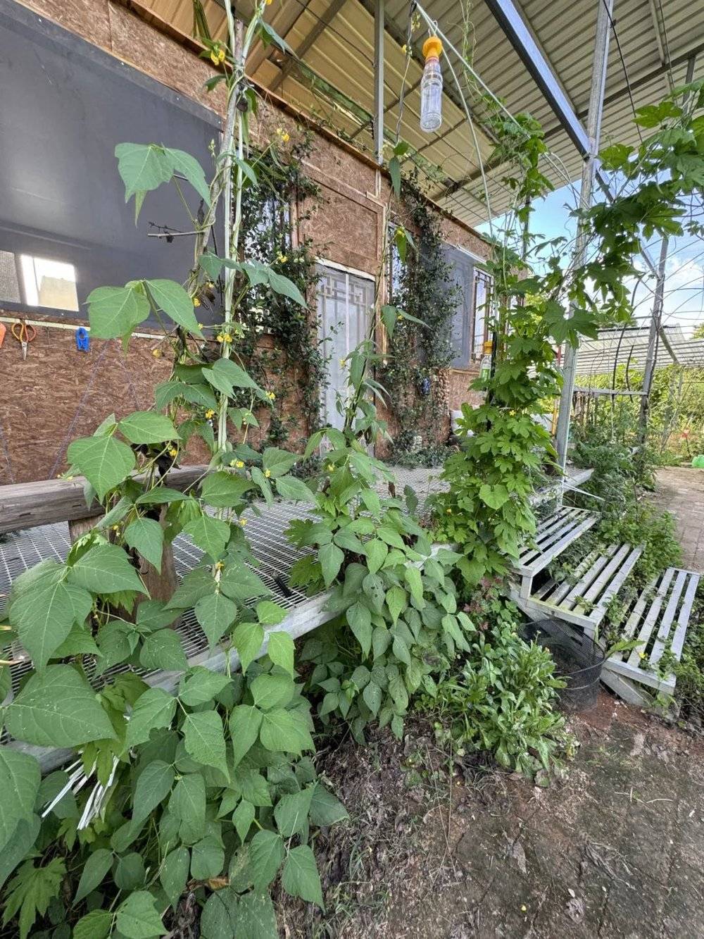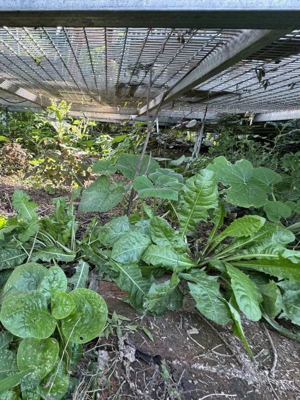 ●“一号”猪屎网下现在的样子,分别有香草、番茄、丝瓜、金盏菊、黄花豆、苦瓜、蒲公英、木耳菜、白菊、紫苏、南瓜。顺着搭好的草绳,爬藤植物会慢慢长上来,一直向上爬,形成一片 “食物的森林”。