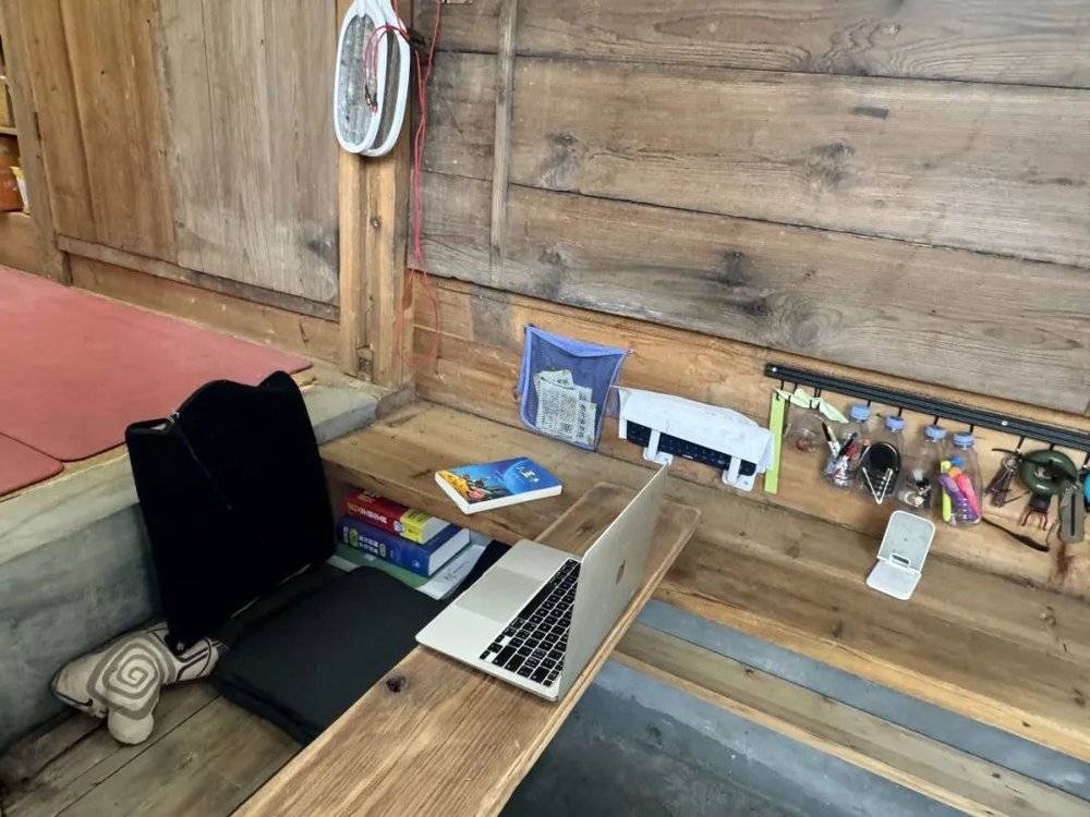 旧门板改成的座位极其宽大,还可以打坐,在这里吃饭翻书都没问题,但须侧位。如果想正襟危坐用电脑写字,下面隐藏木板,打开来就是一个电脑桌。