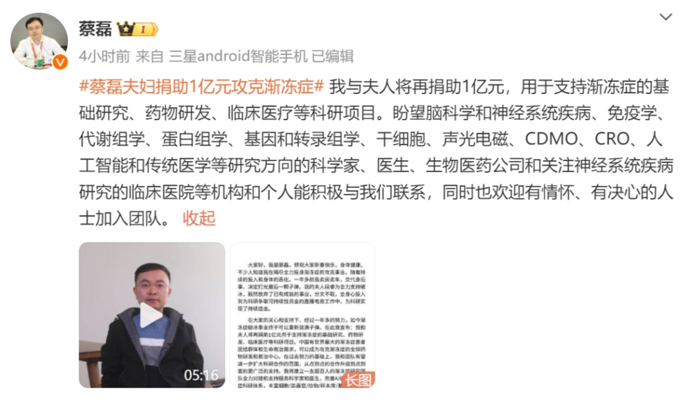 蔡磊心怀大善,身患渐冻症,在治愈这个罕见病上不遗余力。