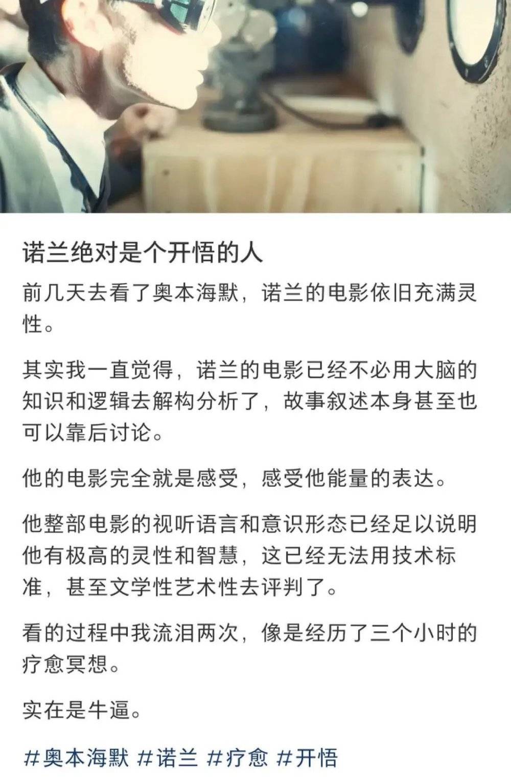 部分影迷觉得诺兰也开悟了,看《奥本海默》犹如经历一场疗愈冥想,《盗梦空间》和《信条》不异于深度净化和催眠,诺兰的伟大无需多言。