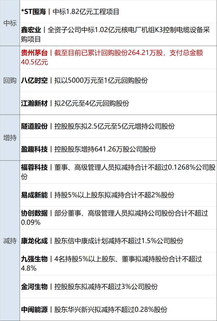 贵州茅台(SH600519,股价1614.13元,市值2.03万亿元):5月16日,贵州茅台公告称,截至2025年5月16日,公司已累计回购股份264.21万股,占公司总股本的比例为0.2103%,购买的最高价为1,639.99元/股、最低价为1,417.01元/股,已支付的总金额为40.5亿元(不含交易费用)。回购股份将用于注销并减少注册资本。