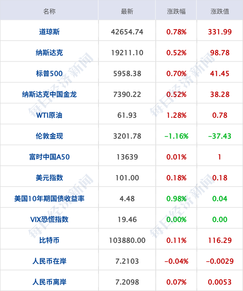 美股三大指数集体收涨,道指涨0.78%,本周累涨3.41%;标普500指数涨0.7%,本周累涨5.27%;纳指涨0.52%,本周累涨7.15%;大型科技股多数上涨,特斯拉涨超2%,奈飞、谷歌涨超1%,微软、英伟达、亚马逊、英特尔小幅上涨;苹果、Meta小幅下跌;其中,本周英伟达累涨超16%,Meta累涨超8%,苹果累涨6.5%。中概股多数上涨,纳斯达克中国金龙指数涨0.52%,本周累计上涨4.56%;小牛电动涨12%,哔哩哔哩涨近7%,蔚来涨近3%,网易、京东跌超2%。