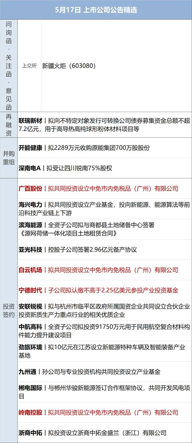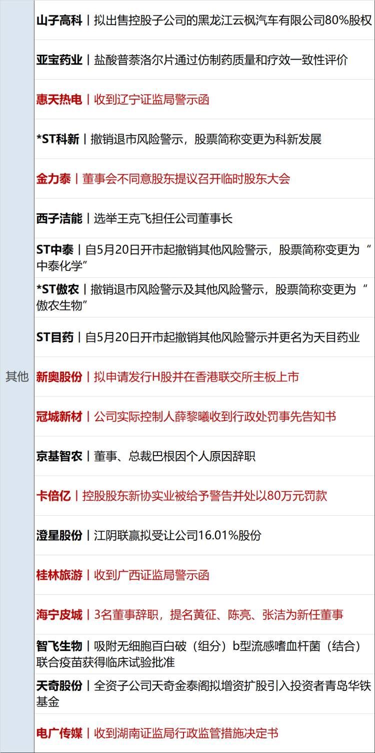 宁德时代(SZ300750,股价259.36元,市值1.14万亿元):宁德时代5月16日晚间在港交所公告,兹提述公司于5月12日刊发的招股章程。H股发售价已于5月15日厘定为每股263.00港元。发售量调整权已获悉数行使,据此,公司将按发售价发行及配发1768.41万股额外发售股份,占全球发售项下初步可供认购的发售股份总数的约15.0%。根据发售量调整权发行及配发的额外发售股份将根据香港公开发售与国际发售之间的初始比例7.5%:92.5%予以分配。假设全球发售于5月20日(星期二)上午八时正(香港时间)或之前成为无条件,预期H股将于5月20日(星期二)上午九时正(香港时间)在联交所主板开始买卖。