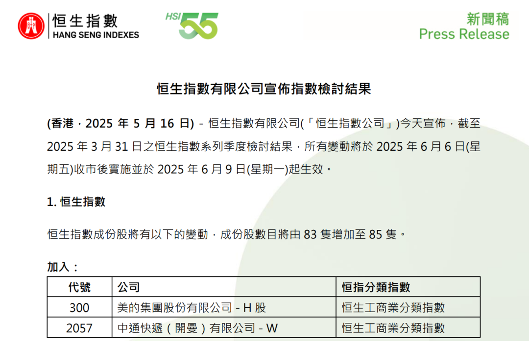 5月16日,恒生指数公司公布季检结果,恒生指数成份股数目将由83只增加至85只,调入美的集团、中通快递;恒生科技指数调入比亚迪股份,剔除阅文集团。