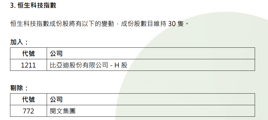 【导读】恒指季检结果公布!比亚迪股份将纳入恒生科技指数