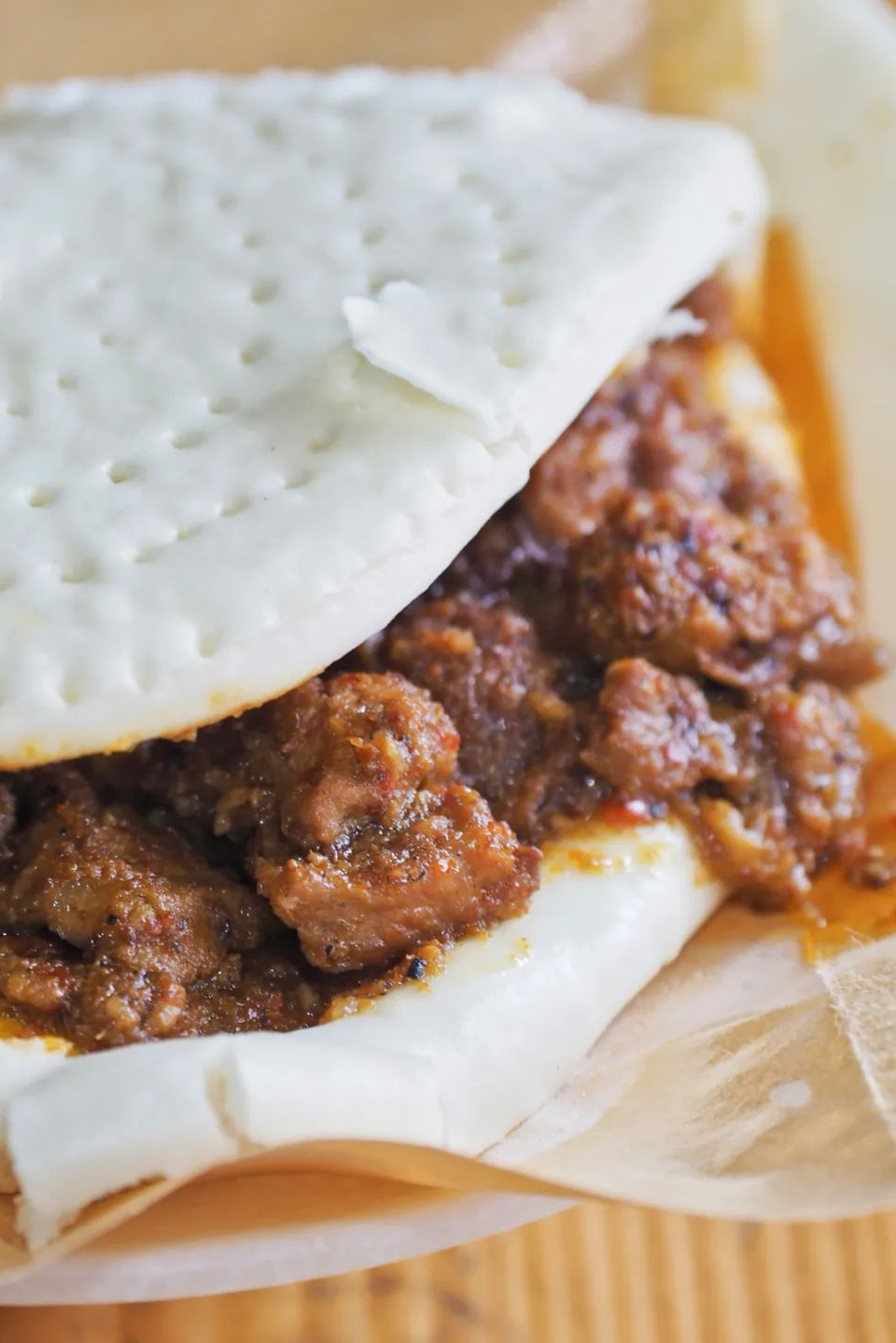 秘制卤水细火慢煮的腊汁肉,肥瘦相间地夹进切开两半的白吉饼中,再浇上一勺香浓的肉汁,一个腊汁肉夹馍能让老陕同时满足咥馍和吃肉的双重需求。腊汁肉固然重要,白吉饼也是肉夹馍地道与否的关键。唯有现烤的饼子才能“焦黄酥脆两张皮”,内里膨胀蓬松,方可将煮得烂糊的五花肉香汁浸透进去。