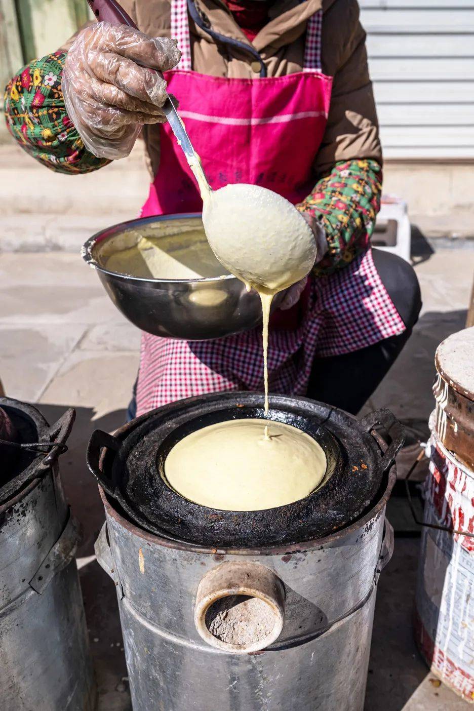 就地取材,陕北人将上好的黄米面(也就是糜子面),包裹着红枣和豆枣泥,蒸出了松软甜香的黄馍馍,为粗犷苍凉的陕北高原提供着细腻甜美的风味。有着“异曲同工”之妙的摊馍馍只烙了一面,吃的时候将馍馍对折成半月形,外侧的焦香、内里的酥甜同时送入口中,糜子面的两种口感都不落下。