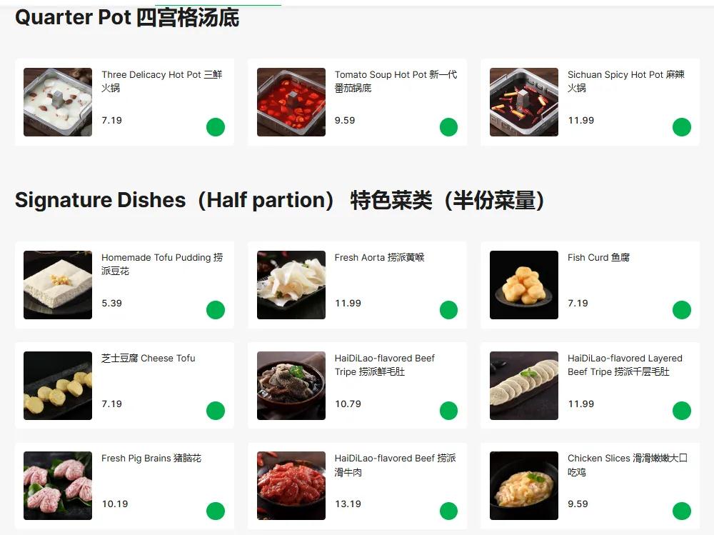 在新加坡Garb外卖平台上,海底捞锅底包括三鲜、麻辣、番茄等。菜品包括以毛肚、豆花为代表的特色菜,以日本和牛、美国经典黑猪肉为代表的肉类,以鱼丸、蟹味棒为代表的火锅菜类,以鲍鱼、牛蛙为代表的海鲜河鲜类,以腐竹、豆腐皮为代表的豆面制品类,以油麦菜、青笋、山药为代表的蔬菜类等等,总体与国内供应的菜品无异。