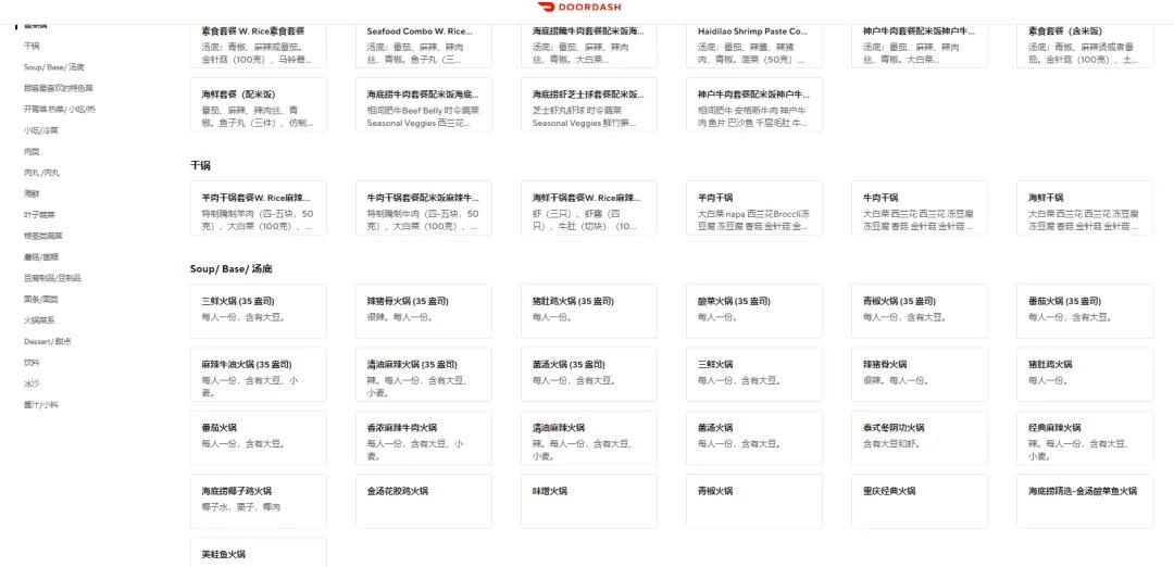 相较于东南亚和东亚,海底捞在北美地区的菜品更加丰富。在北美Door Dash外卖平台上,海底捞不仅包括十几种锅底,且增加面条/面类/饮品类/甜点类,以及干锅冒菜类产品。