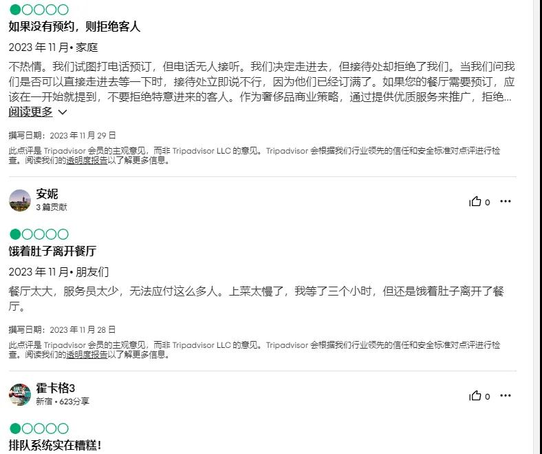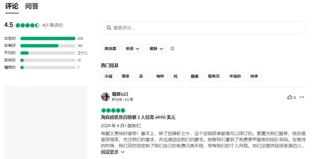 如果服务品质“缩水”,那么海底捞赖以成名的“绝活儿”就显得没那么厉害了。Trip Advisor平台上,不少用户吐槽海底捞新加坡克拉码头店服务员少、排队系统糟糕、无法预订等问题。
