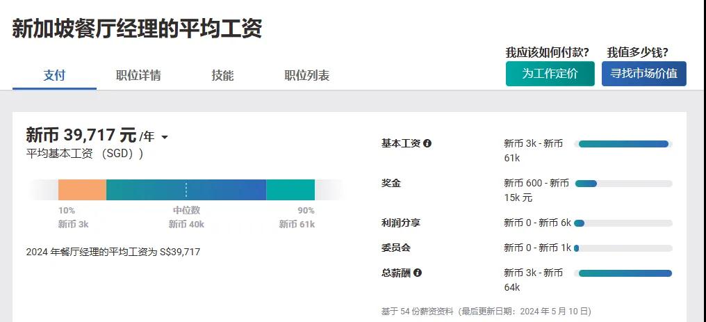 但按照2023年新加坡相关政策要求,食品服务业工人以2023年1750新元(约合人民币9362.5元)为最低工资,按照每年165新元的速度逐步增长,2025年最低工资需达到2080新元。另据Payscale平台显示,新加坡餐厅经理平均年薪已达到39717新元(约合人民币21.26万元)。这一薪资待遇水平已经超出国内同级别工作人员的薪资。