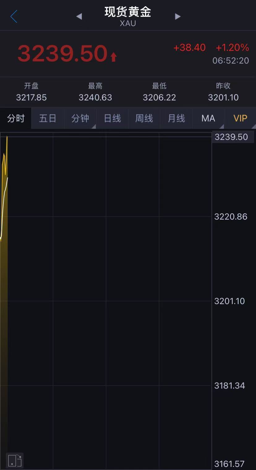 现货黄金日内涨幅扩大至1.2%,报3239.5美元/盎司。