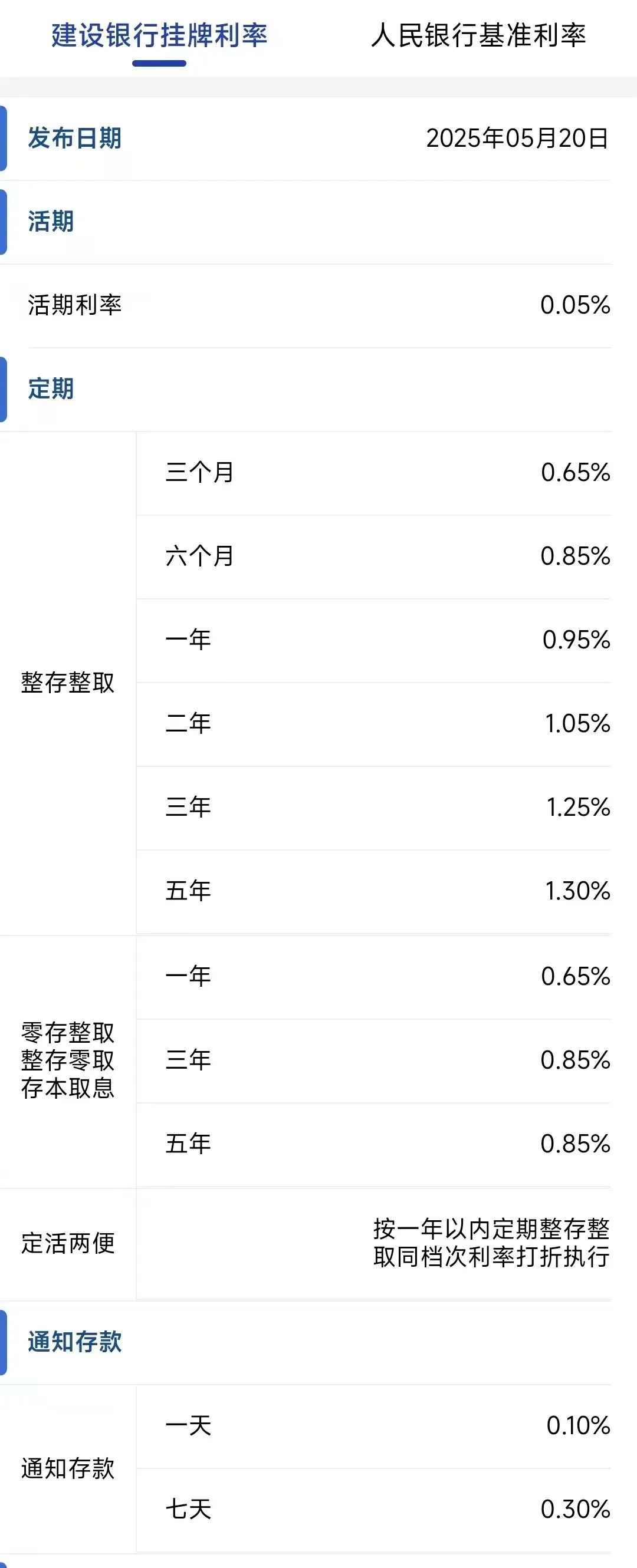 中国建设银行于5月20日下调了人民币存款利率,其中活期利率下调5个基点至0.05%;定期整存整取三个月期、半年期、一年期、二年期均下调15个基点,分别为0.65%、0.85%、0.95%、1.05%;三年期和五年期均下调25个基点,分别至1.25%和1.3%。定期零存整取、整存零取、存本取息三种期限均下跌15个基点。7天期通知存款利率下调15个基点至0.3%。