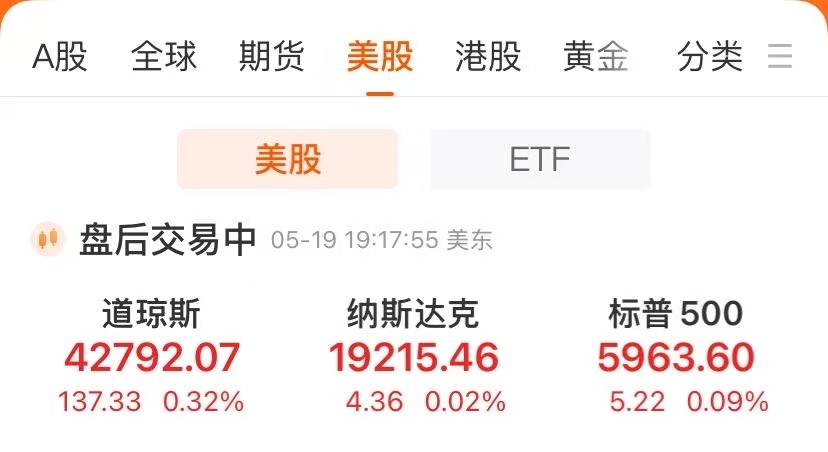 美东时间周一(5月19日),美股三大指数小幅收涨。截至收盘,道指涨0.32%,纳指涨0.02%,标普500指数涨0.09%。