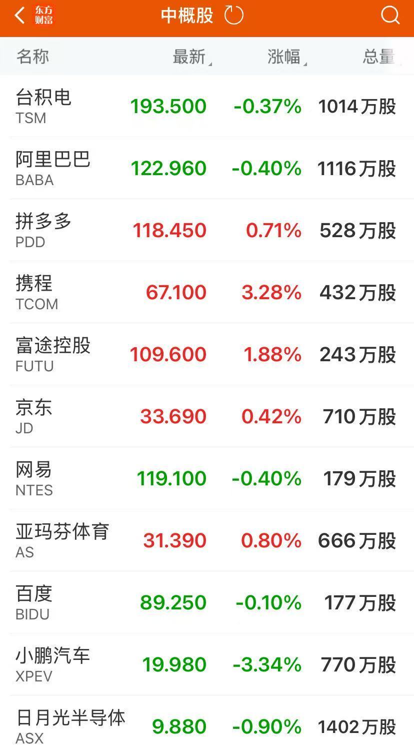 截至收盘,阿里巴巴跌0.4%、京东涨0.42%、百度跌0.1%、拼多多涨0.71%、哔哩哔哩跌4.97%、蔚来跌1.46%、网易跌0.4%、富途控股涨1.88%、理想汽车跌1.67%、小鹏汽车跌3.34%、亿航智能跌7.57%。即将发布自研3nm芯片的小米集团ADR周一收涨3.66%。