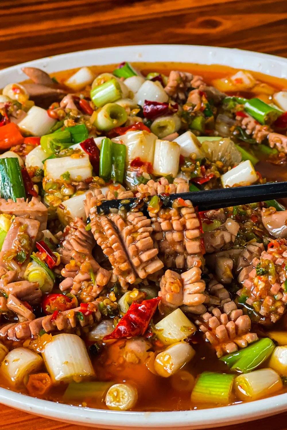 是的,毛血旺也是川中名菜,猪血唱主角,吃的就是一口麻辣香滑,在大邑总与肥肠结伴登场,可谓双倍满足,双倍快乐。