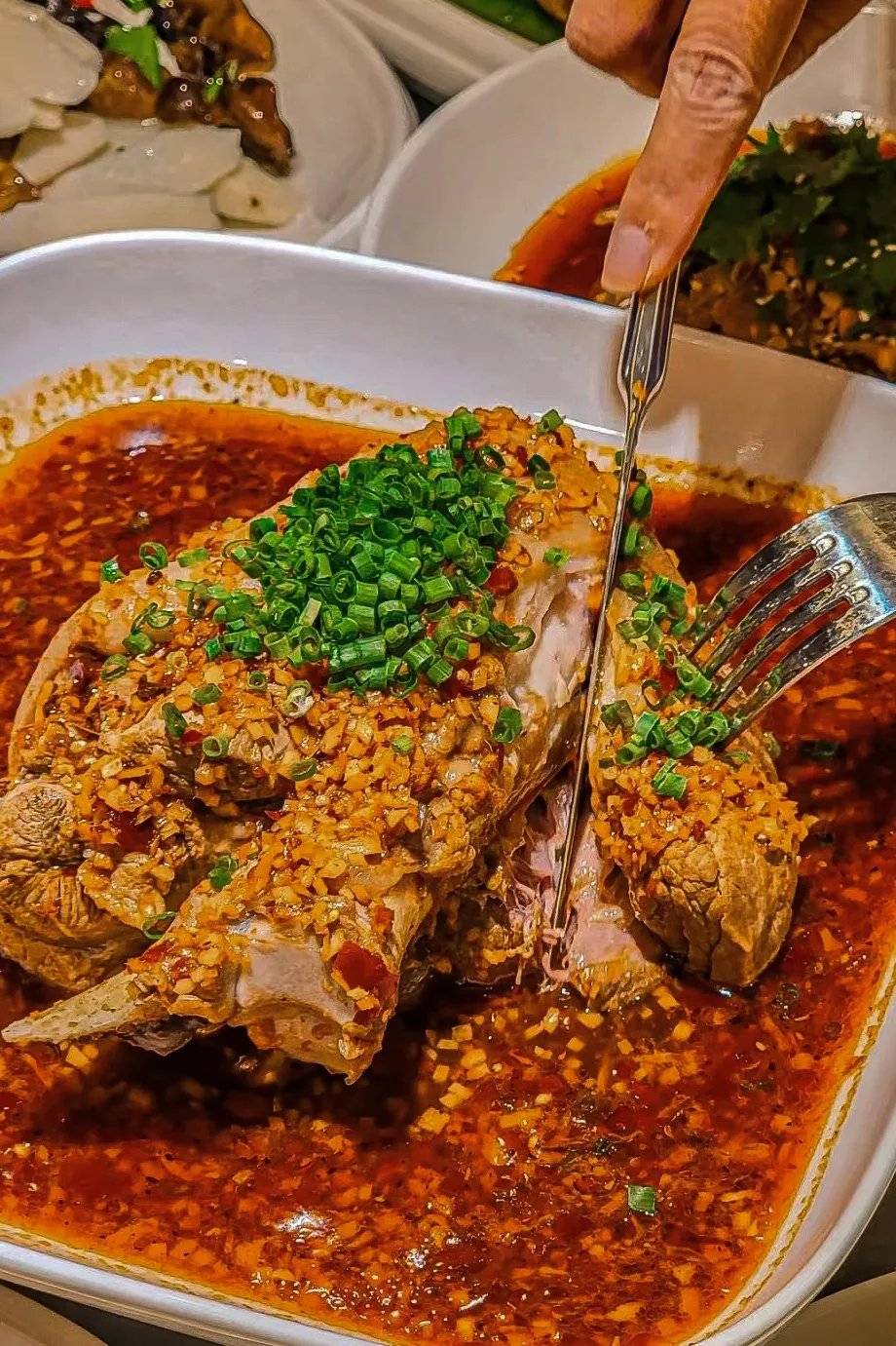 不过既然是眉山的名菜,除了这IP来得大,味道当然也是有些特殊的。与别地煮蹄髈不同,眉山的蹄髈经过炖煮后,再上锅蒸,而调味,则是另起锅灶,将泡菜、香料、酱料剁细后,取用肉汤炒到黏稠,再浇汁在肘子上,看似清爽,实则味厚。