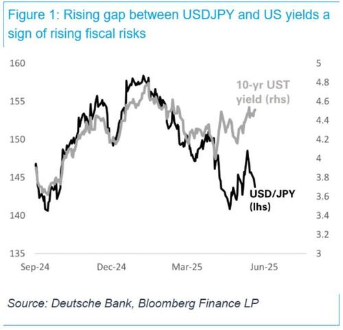 Saravelos注意到了一个近来颇为反常的现象:美债收益率走势与日元汇率出现背离——即使美国国债收益率上升,但外汇市场上日元仍在走强(美元兑日元下跌)。