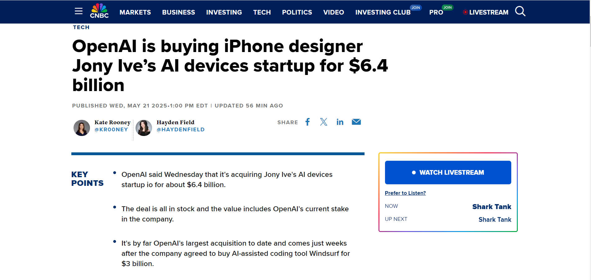 收购完成后,艾维并入OpenAI内部,并承担OpenAI和io的深度创意与设计职责,同时艾维的创意团队Love From将保持独立。OpenAI表示,此次交易将支付50亿美元,因为其已持有该公司23%的股份。此次收购也是OpenAI迄今为止规模最大的一次收购,几周前该公司刚同意以30亿美元收购人工智能辅助编码工具Windsurf。