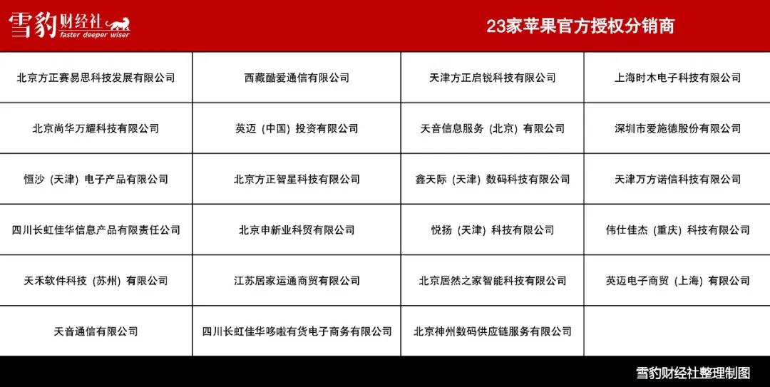 一二线以外的城市,则主要由苹果的授权分销商覆盖。目前苹果官网上有23家授权分销商,它们负责把苹果的产品分销给二级分销商,再分发到全国上万家苹果零售店。