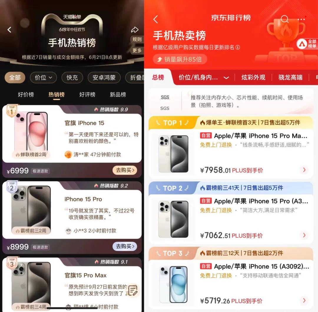 就在刘浩拿到报价单的同时,各大电商平台的618年中大促开启。在拼多多百亿补贴频道中,iPhone 15和iPhone 15 Pro的售价比官方渠道拿货价低300元左右,京东、淘宝、抖音商城的价格也均低于官方批发价。