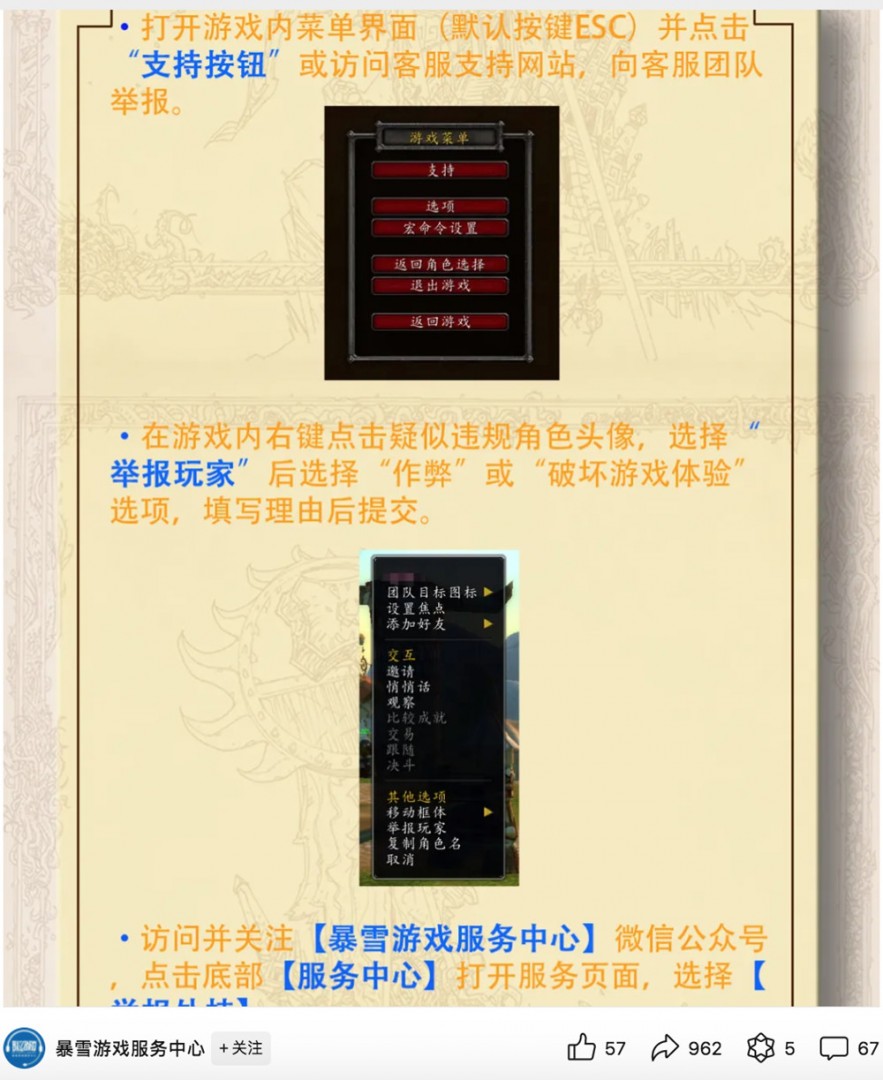 暴雪游戏服务中心官方微信公众号发文称,《魔兽世界》国服团队将严厉打击任何试图破坏游戏平衡和秩序的行为。