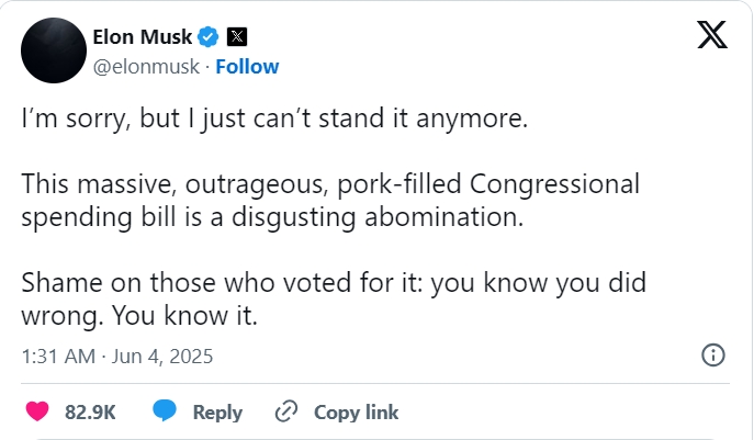 实际上,在此之前,马斯克已多次表达了对“大而美”法案的不满。他表示,该法案将加剧预算赤字,并削弱DOGE团队的工作成果。