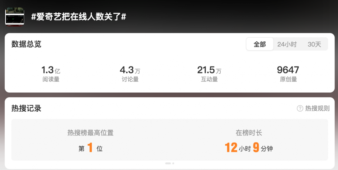 随着舆论持续发酵,“爱奇艺把在线人数关了”登上微博热搜第一,截至发稿,该话题阅读量达1.3亿。