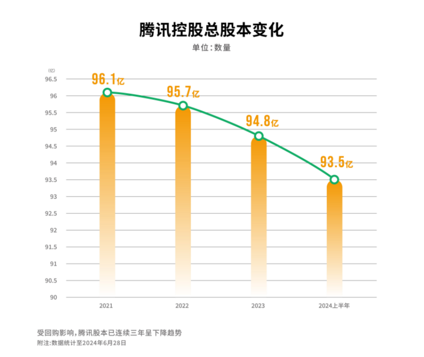 随着腾讯2022年开始加大回购力度,总股本也在稳步减少,已经从2022年的96亿股逐步下降到目前的93.5亿股,股本减少也有利于提高腾讯股票的内在价值。