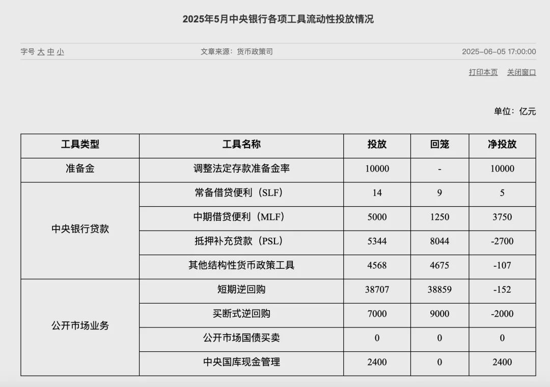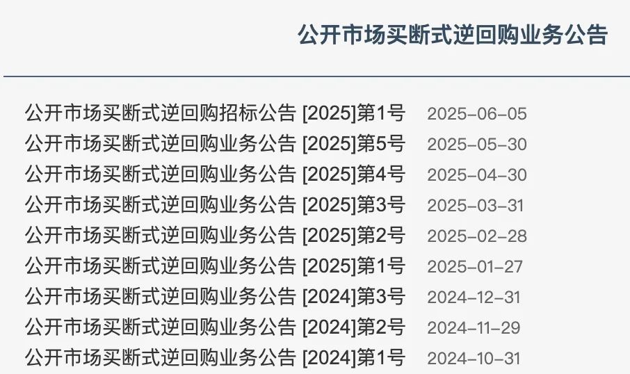 6月5日,央行发布公告,“为保持银行体系流动性充裕,2025年6月6日,中国人民银行将以固定数量、利率招标、多重价位中标方式开展10000亿元买断式逆回购操作,期限为3个月(91天)”。