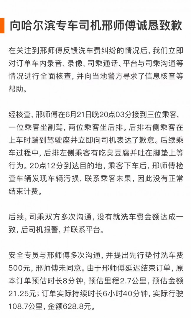 日前,哈尔滨一名滴滴专车司机发布一段视频显示,网约车被乘客涂抹臭豆腐汤汁,司机未及时结束订单被降级。针对此事,滴滴发文回应称,向哈尔滨专车司机邢师傅致歉,一定吸取教训努力整改,不让司机师傅们受委屈。
