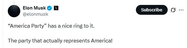 马斯克于6日晚间发文称:“这是命运”。随后,马斯克还表示赞同一位粉丝提出的党名建议——“美国党”(America Party)。
