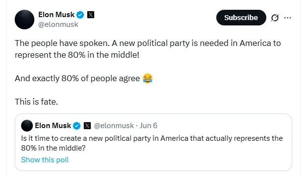 据了解,马斯克于5日首次提出这一想法。他在社交平台上向2.2亿粉丝发起投票,询问是否同意“是时候在美国创建一个真正代表80%中间派的新政党了”。