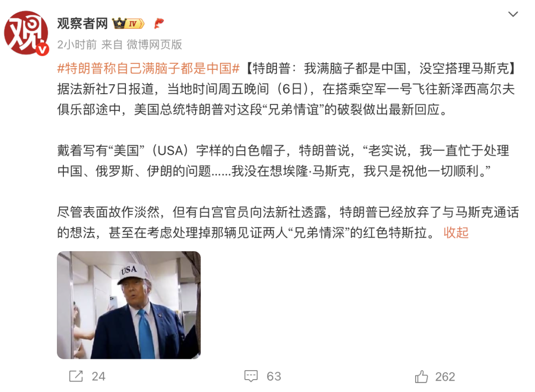 据观察者网援引法新社7日报道,当地时间周五晚间(6日),在搭乘空军一号飞往新泽西高尔夫俱乐部途中,美国总统特朗普对这段“兄弟情谊”的破裂做出最新回应。戴着写有“美国”(USA)字样的白色帽子,特朗普说,“老实说,我一直忙于处理中国、俄罗斯、伊朗的问题……我没在想埃隆·马斯克,我只是祝他一切顺利。”