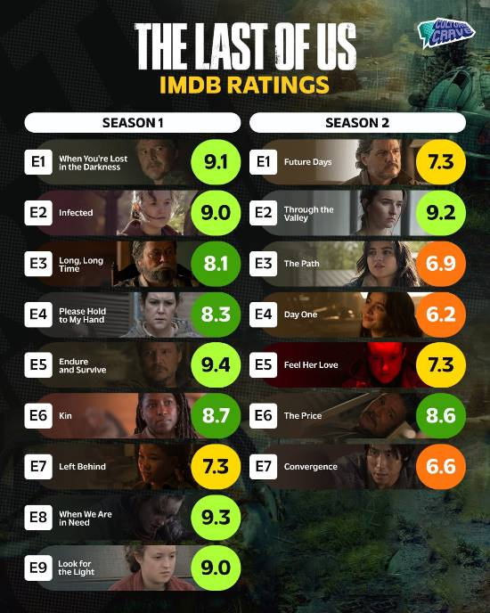 第一季是神剧,第二季全面拉胯。剧情基本忠于游戏,部分更改的情节甚至更好,游戏制作人也是剧集的制作人,按理说质量不应该下滑得如此严重,那么原因就只有一个了:主演。而游戏里 Part 2 的主演有两个,一个是 Ellie,一个 Abby,而 Abby 在第二季里戏份很少,所以答案就很简单了,问题的根源出在 Ellie 的演员身上。小熊女(当时 18 岁)在第一季演的还是 14 岁的 Ellie,倒还可以胜任,但是到了第二季,小熊女(21 岁)演 19 岁的 Ellie 就完全是灾难级的了。