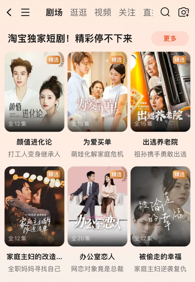 淘宝早在App底部的“直播”板块里,放上了“剧场”的二级入口,里面有大量淘宝独家短剧;今年4月,拼多多在“多多视频”里新增了“短剧”入口,跟“直播”并列;京东也在首页“逛”页面的推荐信息流中,悄悄增加了短剧相关内容。