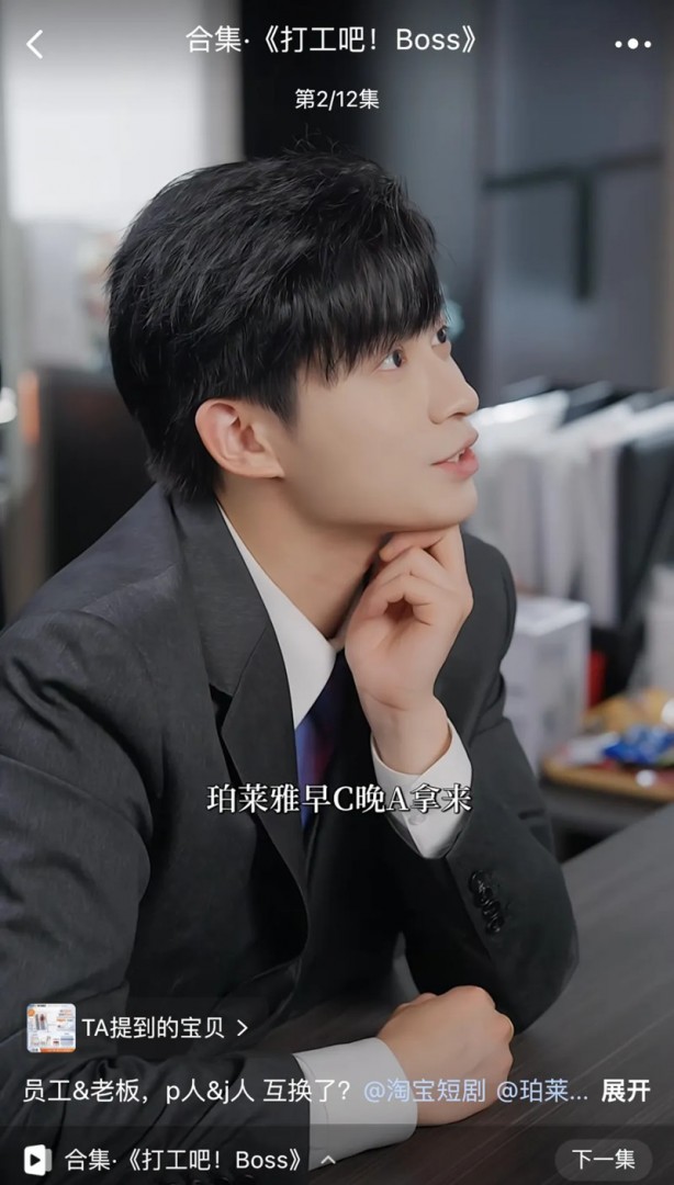 比如珀莱雅冠名的《打工吧!BOSS》,讲的是打工人和老板互换身体,最后霸道总裁爱上我的故事,剧情推进过程中,会反复出现珀莱雅旗下的各款产品,用户能边看边点下方链接买同款。