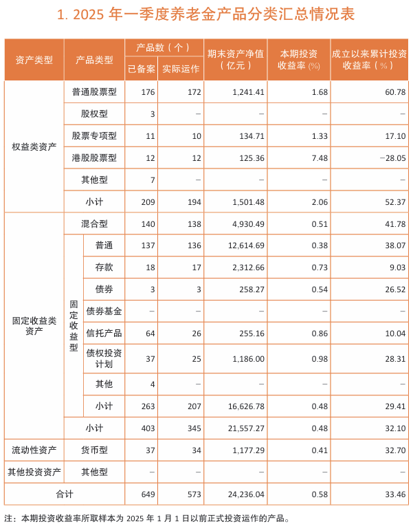 跟企业年金数据一起披露的还有养老金产品的数据,数据显示,截至今年一季度末,养老金产品实际运作数量573个,期末资产净值约为2.4万亿元,一季度的投资收益率为0.58%,成立以来的投资收益率为33.46%。