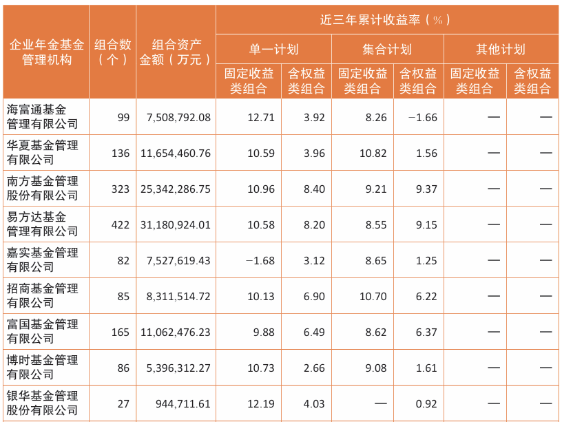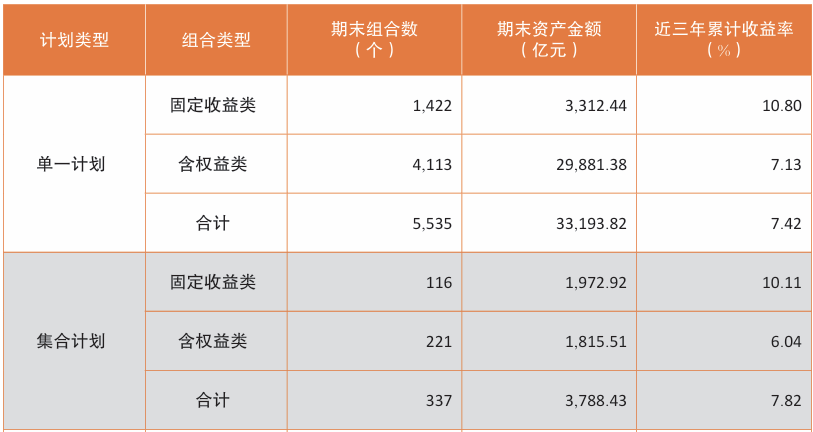 分产品来看,在单一计划中,1422个固定收益类组合期末资产金额为3312.44亿元,近三年的累计收益率为10.8%;4113个含权益类组合期末资产金额约2.99万亿元,近三年的累计收益率为7.13%。