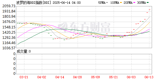 6月13日,波罗的海干散货指数(BDI)涨3.36%,报1968点。本周,BDI指数累计上涨20.51%。最近一个月,BDI指数累计涨幅达54%。