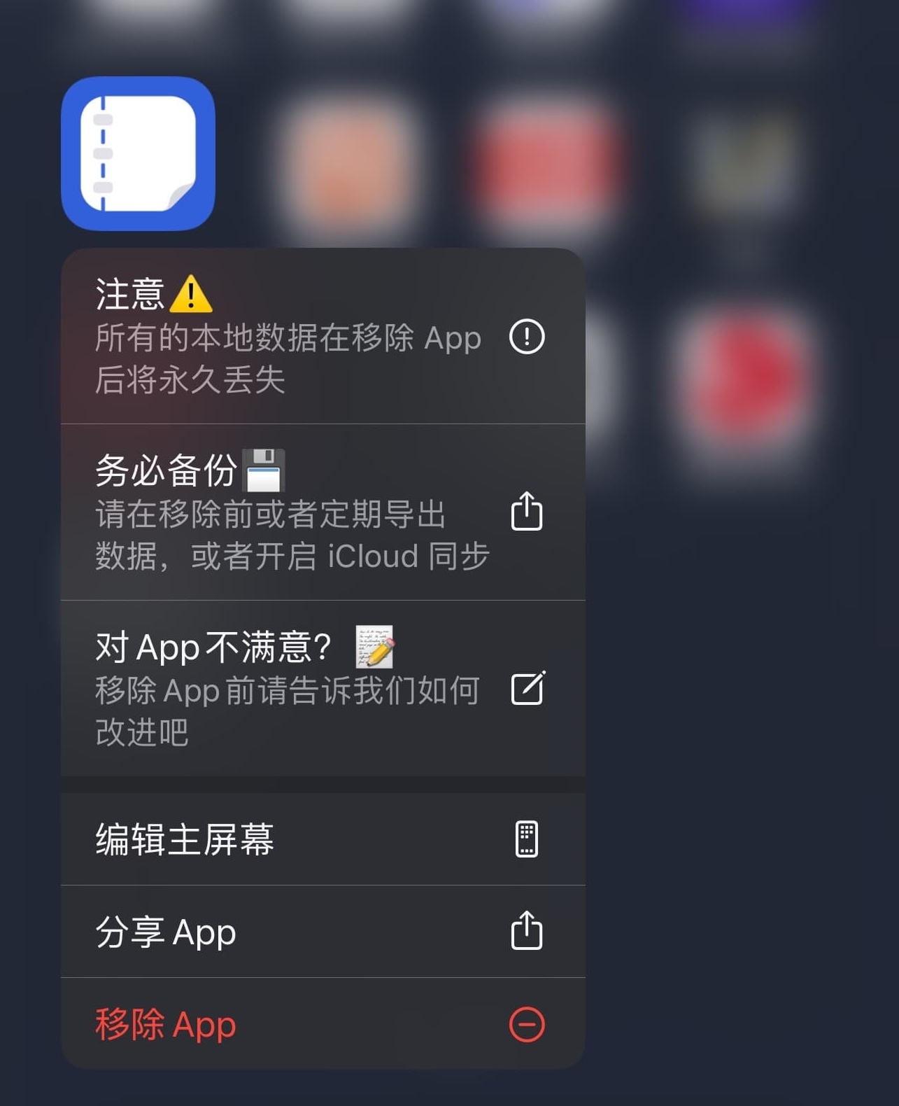 周四提交了 1.7.24,加入了删除 App 时弹出的提示,这个是跟素记 App 学的。太多人询问删除 App 后数据还能否恢复了,希望这个提示能起到作用。