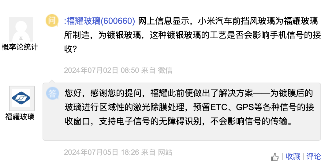 福耀玻璃回应小米SU7汽车前风挡玻璃信号问题
