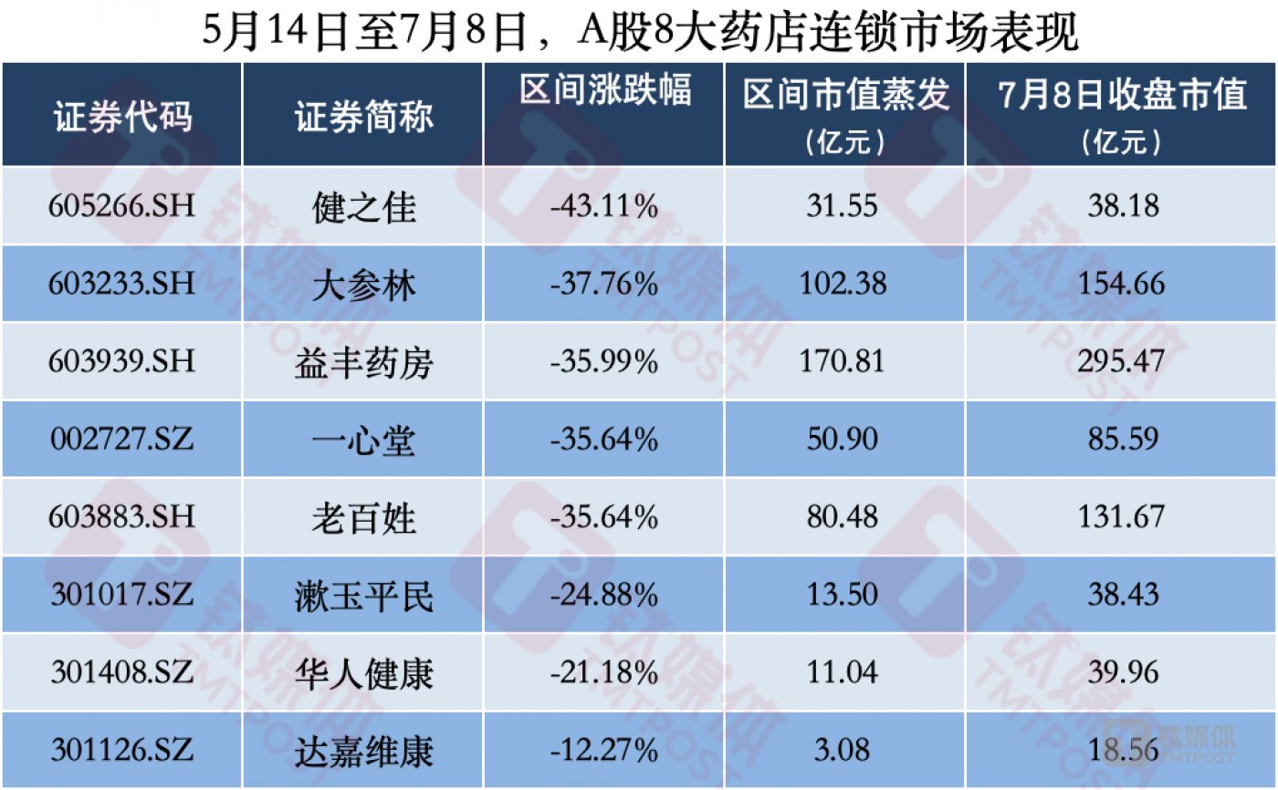 据古方信息网统计,于2024年5月14日至7月8日的下跌区间内,健之佳累跌超43%,益丰药房(603939.SH)、大参林、老百姓、一心堂四大“万店”连锁的股价累计跌幅都超过30%,A股的8大药店连锁企业市值总共蒸发463.74亿元。