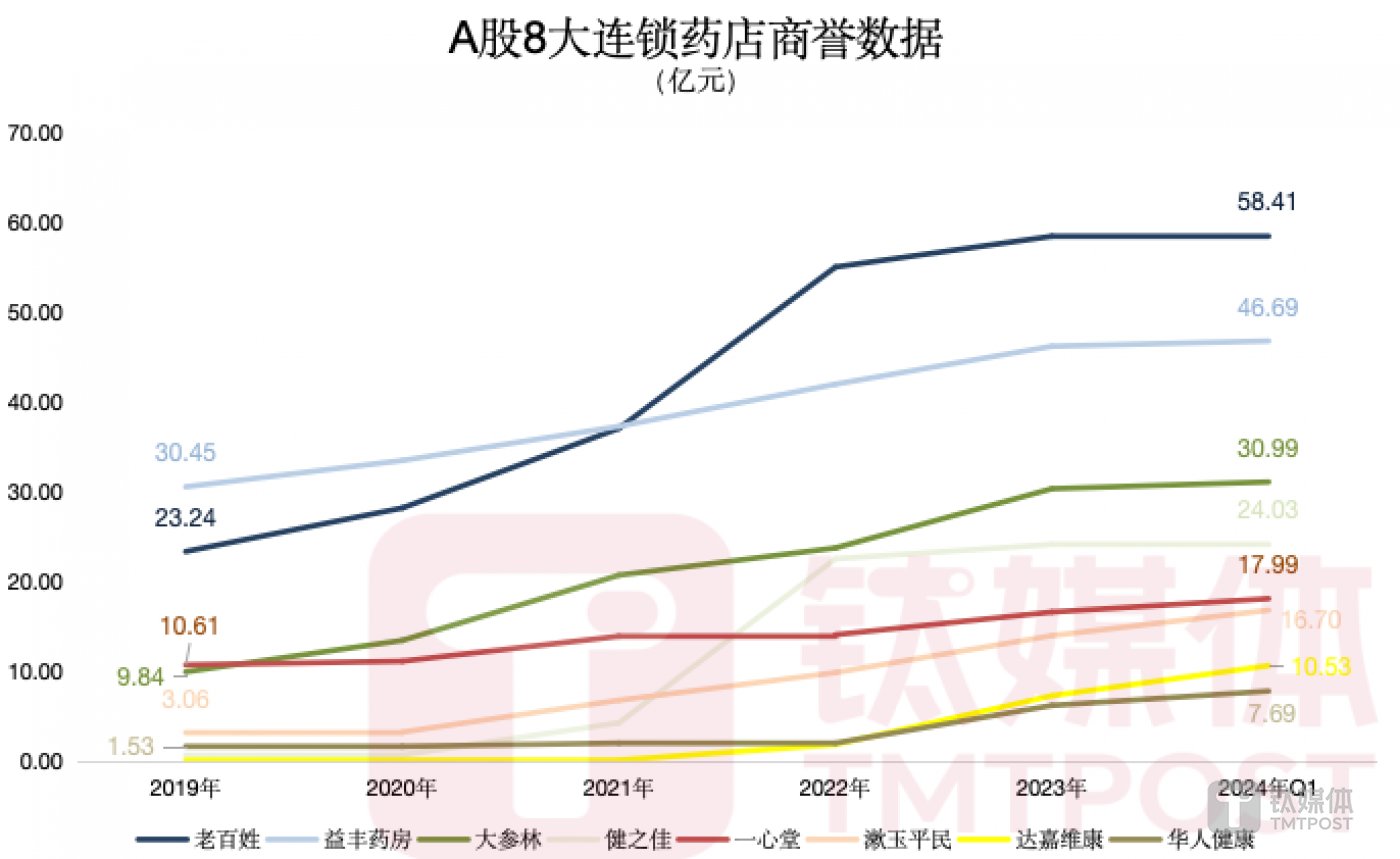 首先,上市连锁的商誉逐年激增。截至2024年一季度末,老百姓商誉已经达到58.41亿元,是8大上市连锁中最高,5年翻了2.5倍,健之佳增长最为迅猛,从2019年0.58亿元激增至24.03亿元。