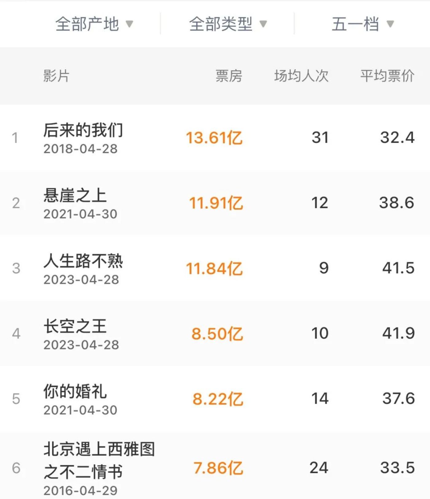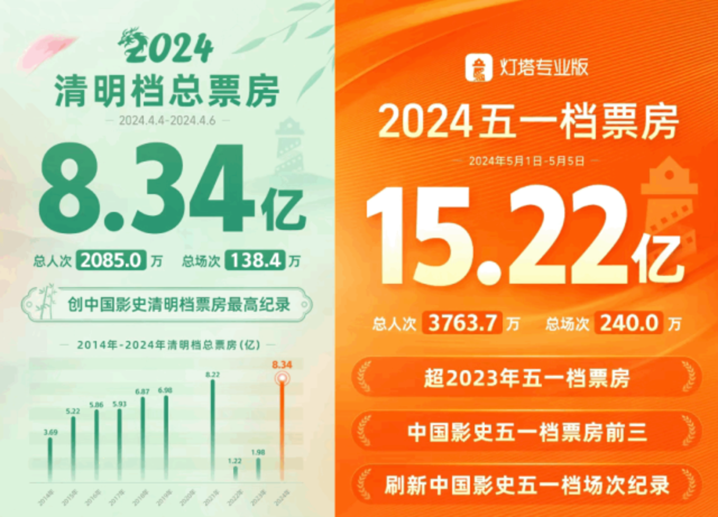 然而形成强烈反差的是,今年的清明节档以8.34亿的成绩刷新了中国影史清明节档票房最高纪录,五一档日均大盘3.05亿,位居档期影史第四,放映场次刷新档期影史纪录。在这种情况下,各个档期仍未让电影票房保证上扬势头,可见大盘冷热不均情况之严重。