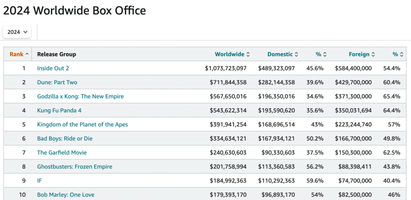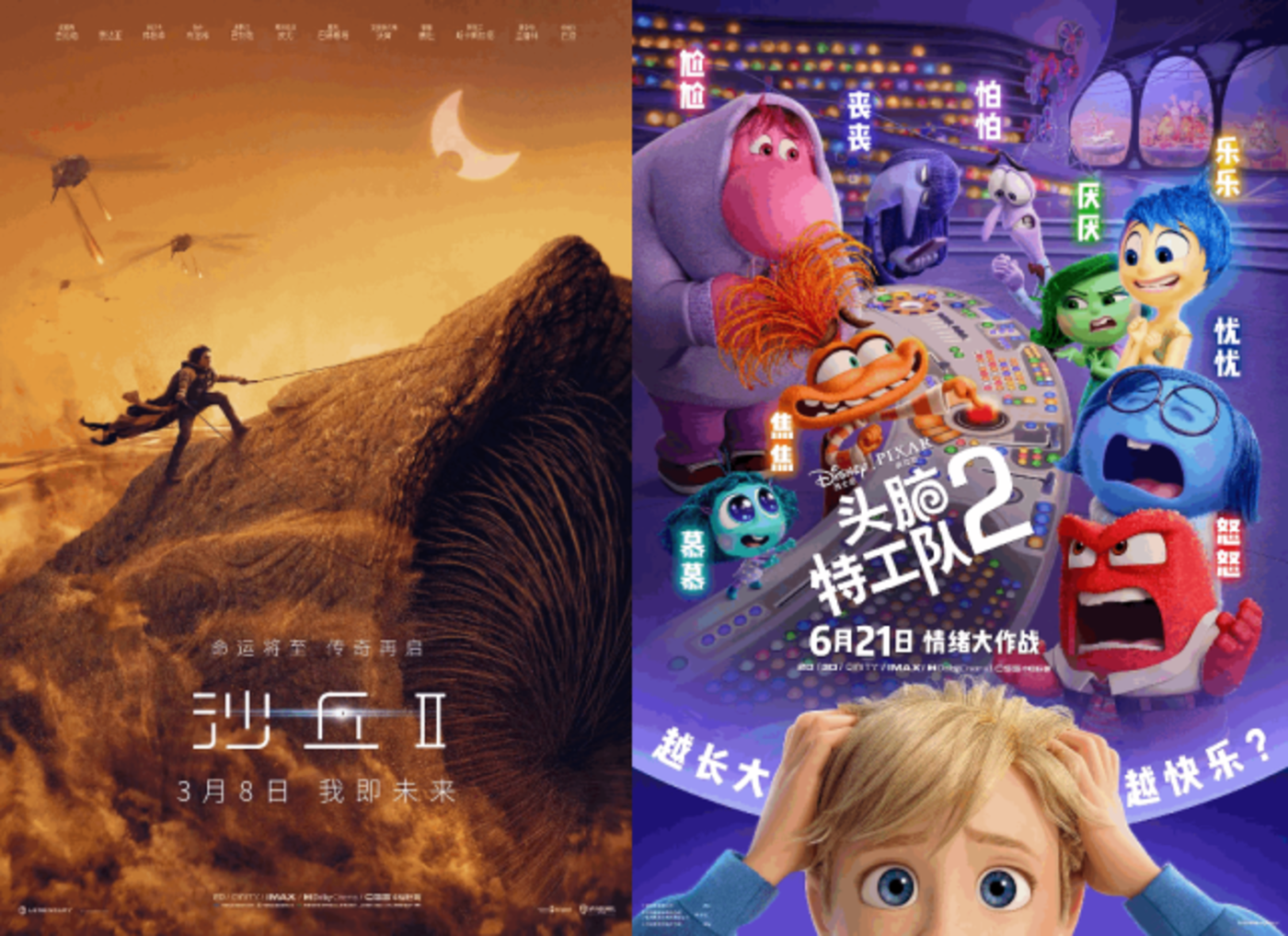 在国产片无力提供更多内容供给的情况下,引进片也未能支撑起大盘希望。今年上半年,引进片依旧占据着电影大盘中不高的比重。根据灯塔数据显示,引进片占比15.3%,同比去年升高1.8%,远不及疫情前。疫情之后,观众对于引进片的兴趣持续性滑落,尤其是以前撑起票房大盘的好莱坞大片,已经许久没有出现超10亿的电影了。对比海内外的市场表现,这种差距格外明显。《沙丘2》《头脑特工队2》是目前全球票房第一二位,作为全球十大票仓之一的中国,贡献占比却并不算多,《沙丘2》的全球票房中,中国以4904万美元的成绩位列第三,《头脑特工队2》更甚,中国以2900万美元的成绩位列全球第七,不及巴西、意大利。