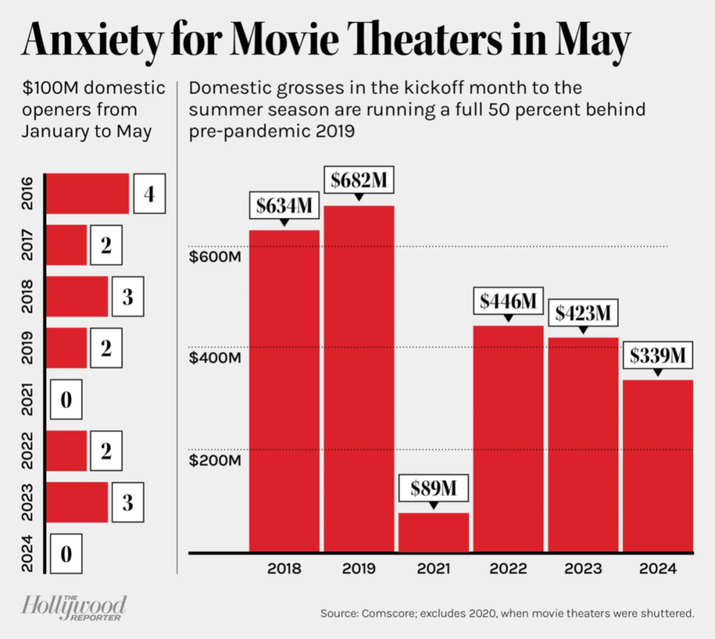 一般来说,5月是好莱坞的暑期档“前哨战”,但一如国内的6月票房一样,整个市场大盘最是惨淡。5月1日至19日期间,北美票房收入较去年下降近20%,比 2019年下降50%。“我们知道情况会很糟糕,但没想到会这么糟糕,”一位顶级电影公司高管接受《好莱坞报道》时说道。