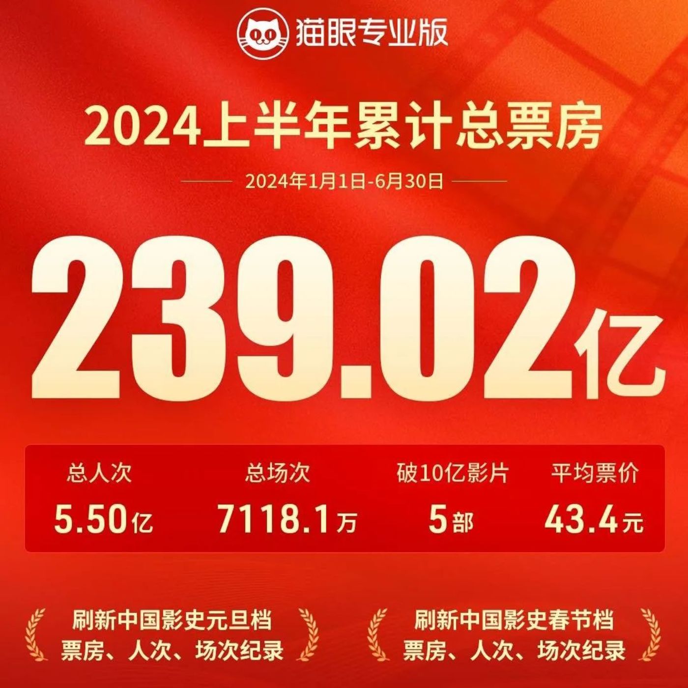2024年上半年电影市场在尤其萎靡的6月大盘中落下帷幕。据猫眼专业版显示,上半年总票房239.02亿,同比减少23.28亿;平均票价43.4元,同比去年差距不大;总人次5.5亿,同比去年减少5300万人次;总场次7118.1万,同比去年增长843.2万。也就是说,在票价不变、场次增长、人次降低的情况下,总体票房下降了8.8%,观影人次的流失是主要原因。