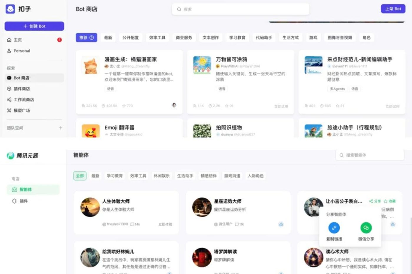 从两家大厂的入局时间点来看,都足以印证对AI应用的重视。一方面,基础模型层的价格战,实则直接减少了开发层和应用层玩家们的成本,另一方面,在移动互联网时代就擅长做应用、有生态的腾讯和字节,还瞄准了AI应用的分发环节,通过旗下的AI智能体创作与分发平台「扣子」和「腾讯元器」,旨在建立AI应用从「开发-分发-应用」的闭环,这其实比OpenAI们此前做的「GPTs商店」多走了一步。